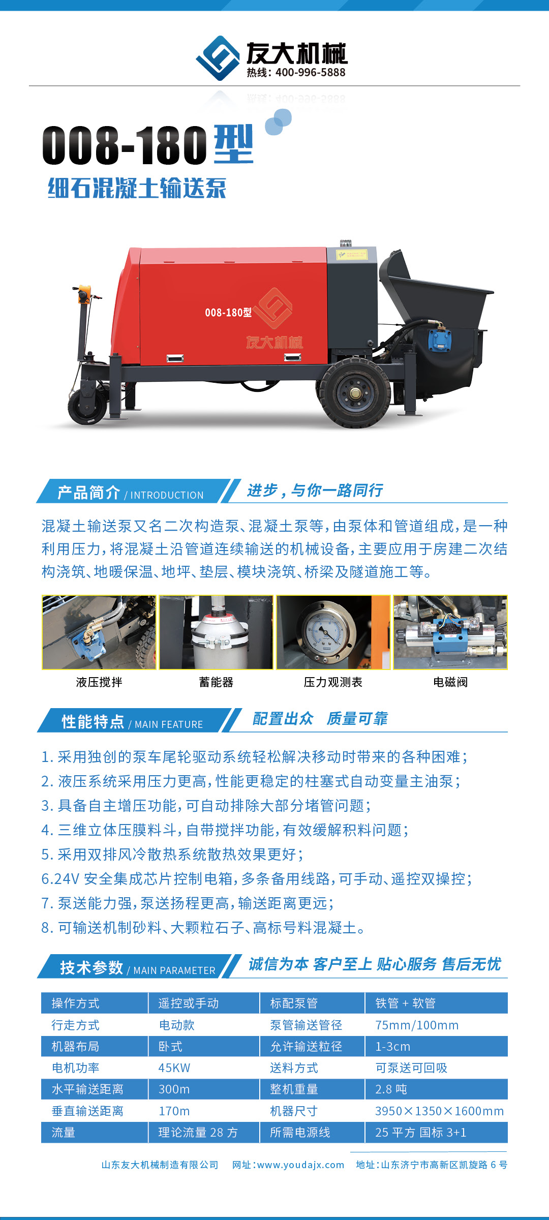 采用泵车尾轮驱动系统轻松解决移动时带来的各种困难,采用双排风冷散热系统散热效果更好,液压系统采用压力更高,性能更稳定的柱塞式自动变量主油泵,采用先进的三维立体压模一体式自动搅拌料斗可输送...